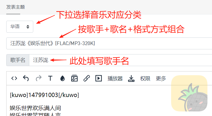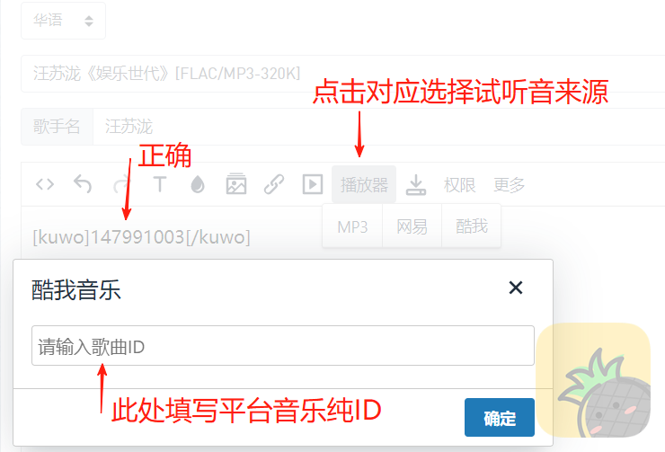 3、音乐试听,发布框上部“播放器”,将对应平台音乐ID填上直接确认即可!优先酷我音乐及网易云音乐ID(非VIP);