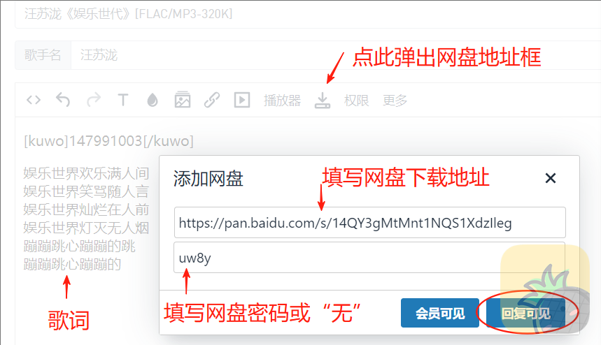 4、下载地址及密码,本站不支持上传本地,仅支持网盘发布,发布框上有下载按钮,对应填写网盘链接及提取码,点击“回复可见”